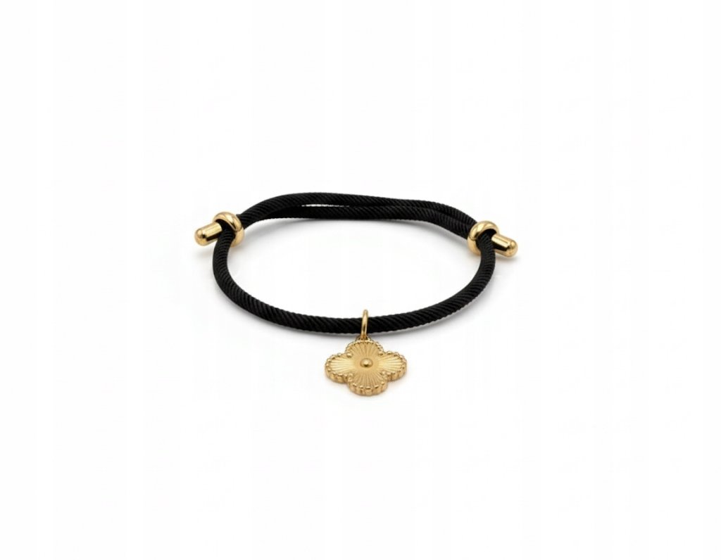 Odkryj idealne połączenie nowoczesnego designu, trwałości i subtelnej symboliki! Ta elegancka bransoletka na czarnym sznurku, ozdobiona lśniącą złotą koniczynką, to nie tylko piękny dodatek, ale także talizman szczęścia, który doda blasku każdej stylizacji. Wykonana z wysokiej jakości stali nierdzewnej / chirurgicznej 316L, gwarantuje komfort noszenia i długotrwały, piękny wygląd.Bransoletka wykonana jest na bazie trwałego, czarnego sznurka, który jest nie tylko wytrzymały, ale również bardzo wygodny w noszeniu. Dzięki praktycznemu, regulowanemu zapięciu typu shamballa, bransoletka idealnie dopasuje się do każdego nadgarstka, niezależnie od rozmiaru. Możesz ją nosić luźno lub bardziej dopasowanie – tak, jak lubisz najbardziej!