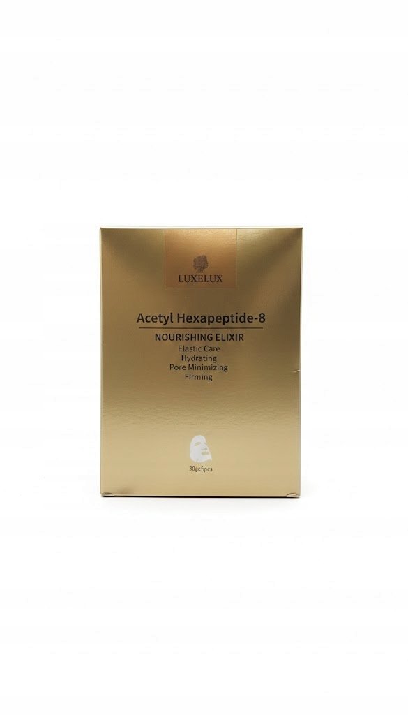 LUXELUX Nourishing Elixir to luksusowa maska w płachcie nasączona skoncentrowanym serum z Acetyl Hexapeptide-8. Ten innowacyjny składnik, nazywany „bezinwazyjnym botoksem”, pomaga rozluźnić napięcie mięśniowe, co prowadzi do widocznego wygładzenia zmarszczek i poprawy owalu twarzy.