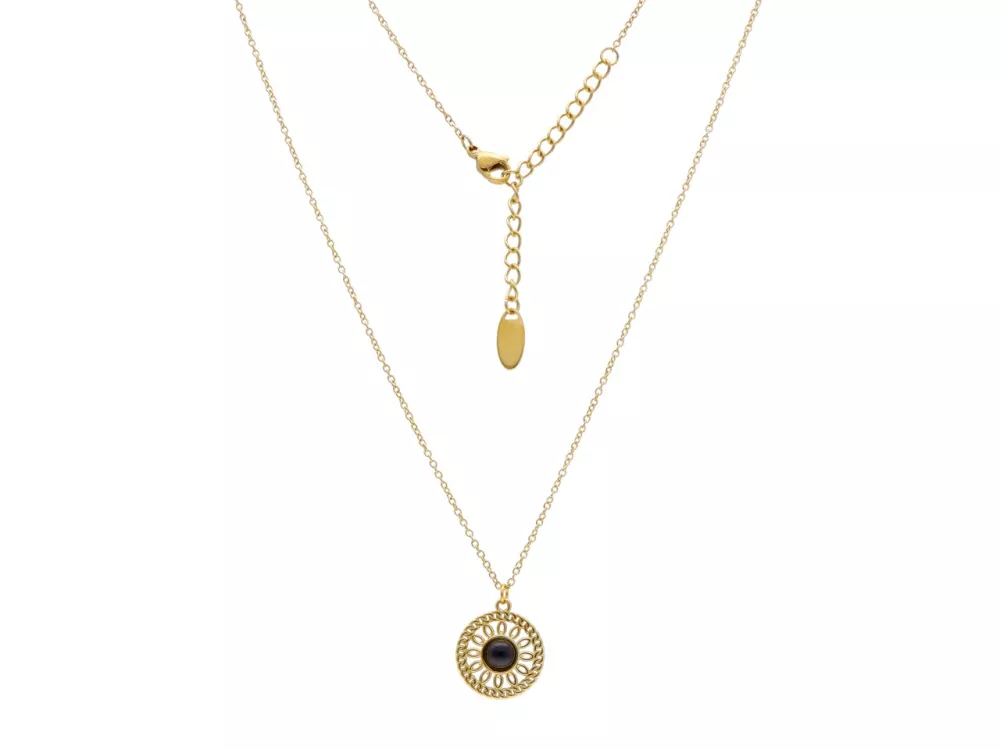 Zachwycający naszyjnik, który przyciąga wzrok modną zawieszką w kształcie koła. Głęboka czerń imitująca onyks, otoczona lśniącymi cyrkoniami, tworzy wyrafinowany i luksusowy dodatek. Wykonany z trwałej i bezpiecznej stali chirurgicznej.